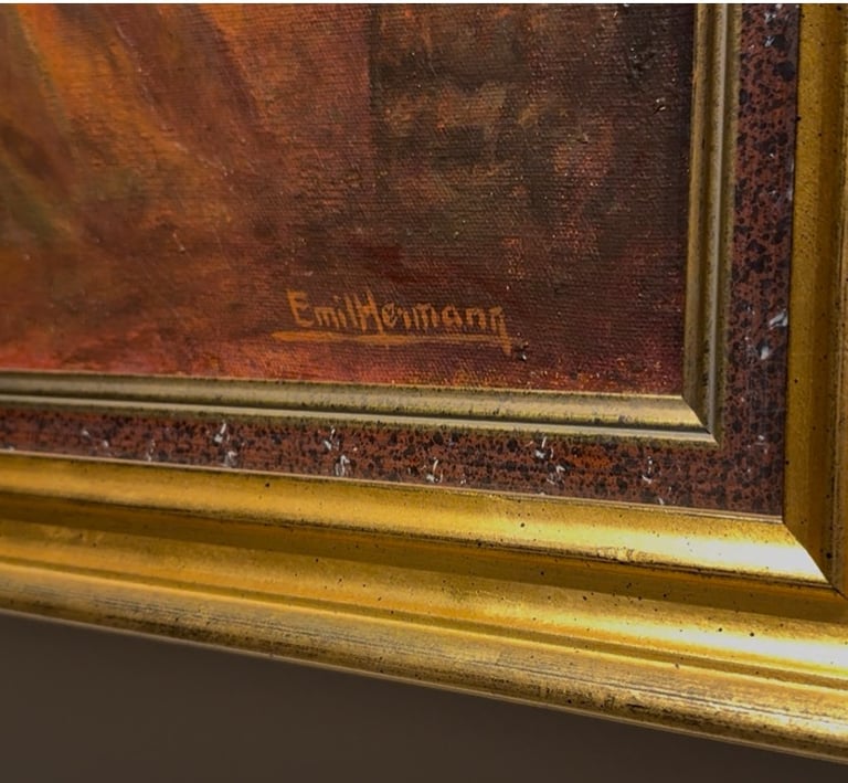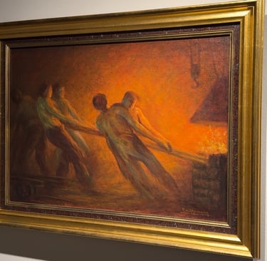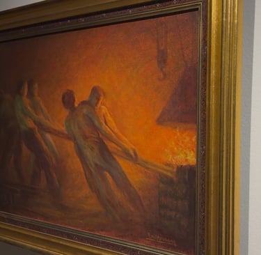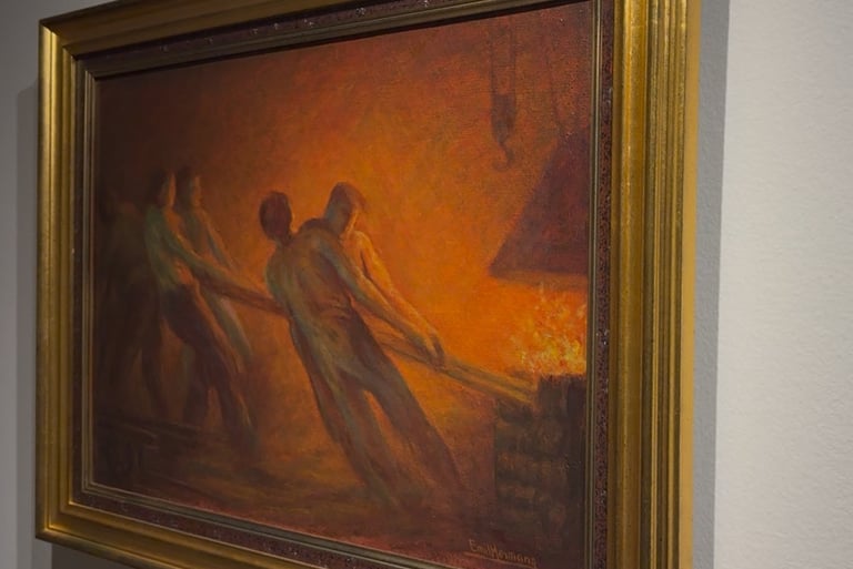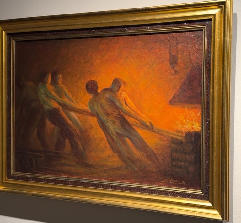 Foraged in 46 was painted by Emil Hermann in 1946, capturing ironworkers pulling steel from the forge during a defining era of American industry. Over time, viewers have paused at the central figure, noting a natural resemblance to Donald Trump an observation made even more interesting by the fact that both the painting and Trump were born the same year. Hermann left no record of who the worker was, leaving the story open for viewers to interpret. This blend of craftsmanship, history, and coincidence has become part of the painting’s unique appeal.